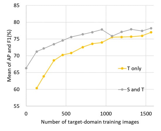 First, we trained a reference detector for performance evaluation. For implementation, we customized the SSD implementation of ChainerCV [46] according to the procedure described in Section 3.1. The batchsize was 32, which was the same as in the original paper [9]. We trained the reference detector using Dataset T_labels. Specifically, we started using four images of the target domain training data with annotations and gradually increased the number of images in increments of four. We obtained target domain training patches by separating those 1000 × 1000 pixel images into a 300 × 300 pixel grid and duplicating them by rotating them by 90, 180, and 270 degrees as described in Section 4.1. (Note that the number of training image patches does not increase exactly linearly, because we excluded patches that did not contain a vehicle.) The final number of training patches reached 1564, which was close to the average number of source domain training images per region. We trained two detectors: with Dataset S_train and without Dataset S_train. Training iterations were up to 50,000 with a source domain and up to 20,000 without a source domain (until the loss values converged sufficiently). Figure 7 shows the performance curve on the Dataset T_test. The accuracy seems to have reached near the upper limit when all the target domain training data with annotations were used, and the model trained on both of Dataset S_train and T_labels was slightly better. We use the highest accuracy (78.2% of mean of AP and F1) as a reference score in performance evaluation.