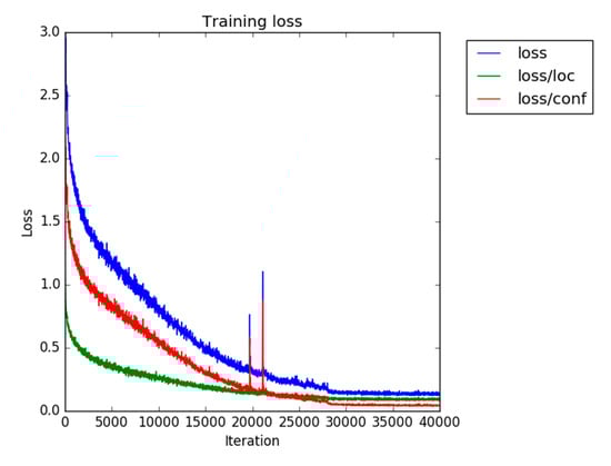 Next, we trained a detector only on the Dataset S_train. The number of training iterations was 40,000, and we changed the schedule of learning rate decay to 28,000 and 35,000 iterations. Figure 8 shows the training curve. Training duration was approximately 18 h on Nvidia Tesla T4. Although there are peaks around 20,000 iterations, it seems to have been caused by random effect because any peak could not be seen in another run. Since the overall trend was stable and training finished successfully, we used the obtained model in the subsequent experiments.