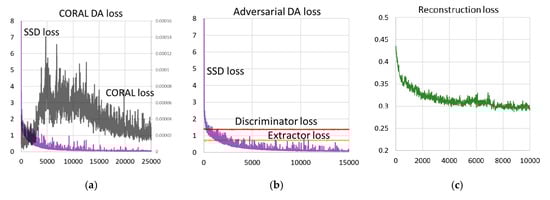 Figure 12 shows the reconstructed image samples from source and target images by adversarial DA with reconstruction. Even after the training proceeded, the reconstructed images remained vague. This would be because the SSD detection network effectively learned “sparse” features that are only useful for vehicle detection. Compared to the background, vehicles appeared relatively clearly in the reconstructed images. The reconstruction objective worked successfully to learn semantic features, not interfering with the detection task. While the sensitivity of parameter was not extreme according to Table 3, the best accuracy was obtained at . We could say that the orders of magnitude of reconstruction loss value should be close to the other loss functions.