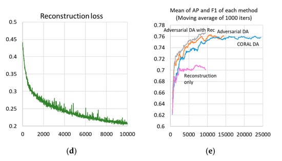 Adversarial DA with reconstruction further improved accuracy that was slightly better than the reference score. Reconstruction loss was not the sole contributor to this performance because the performance of the reconstruction only method was not good (Table 2). Combining reconstruction loss with adversarial DA seems to have effectively worked and facilitated leaning semantic features in the target domain. Further, the reconstruction loss reduced the required iteration number compared to adversarial DA, while calculating the reconstruction objective took additional computational cost in one iteration. Adversarial DA with reconstruction took about 9 h for 9020 iterations, which include a reasonable additional cost (1.5 h) compared to adversarial DA.