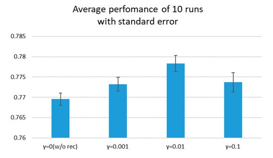 To investigate the effectiveness by reconstruction objective and sensitivity of parameter , we repeated experiments of 10 times. All of the statistics are shown in Table 3 and the averages with standard errors are shown in Figure 10.