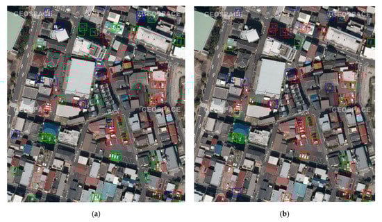 Figure 11 shows detection example images. According to the quantitative measures in Table 2, the main contributor of performance improvement by DA is RR improvement. As evidence, while there were many undetected vehicles (green bounding boxes) in Figure 11a, they were significantly reduced and changed to correct detections (red bounding boxes) in Figure 11b.