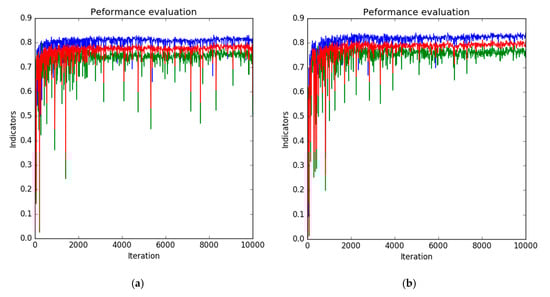 Validation curve of methods in Section 4.7: (a) without reconstruction, (b) with reconstruction. Blue, green, and red lines represent F1, AP, and mean of F1 and AP, respectively.