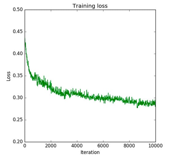 One drawback of the DA method is its instability. Since the DA objective is only to learn target domain features that look similar to source domain features, learnt features can deviate and cause instability. Figure 13a shows the raw validation curve of the method without reconstruction in Section 4.7. Although overall training proceeded successfully, the outlined values appeared frequently in Figure 13a. This is one of the reasons that we adopted the strategy of saving a snapshot that scored the best validation accuracy on Dataset T_val. This instability can be mitigated by a reconstruction objective, as Figure 13b shows, because the reconstruction objective is a conditional, stable objective. A similar effect is reported in [52]. Additionally, we can judge the end of training by checking the trend of reconstruction loss. As Figure 14 shows, reconstruction loss converged at around 10,000 iterations, which was the same as the validation curve in Figure 13b. This would free us from preparing a validation dataset and taking snapshots during training.