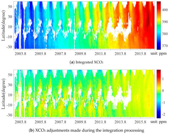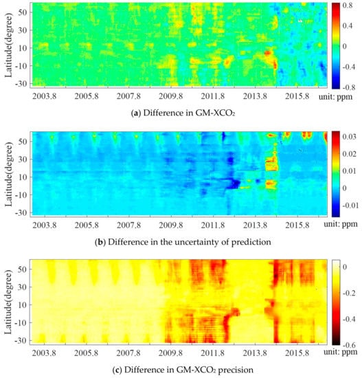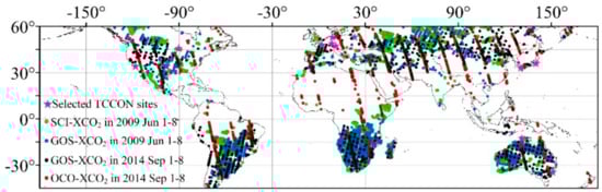 - Wang, T.; Shi, J.; Jing, Y.; Zhao, T.; Ji, D.; Xiong, C. Combining XCO2 measurements derived from SCIAMACHY and GOSAT for potentially generating global CO2 maps with high spatiotemporal resolution. PLoS ONE 2014, 11, e0148152. [Google Scholar] [CrossRef] [PubMed]
