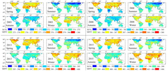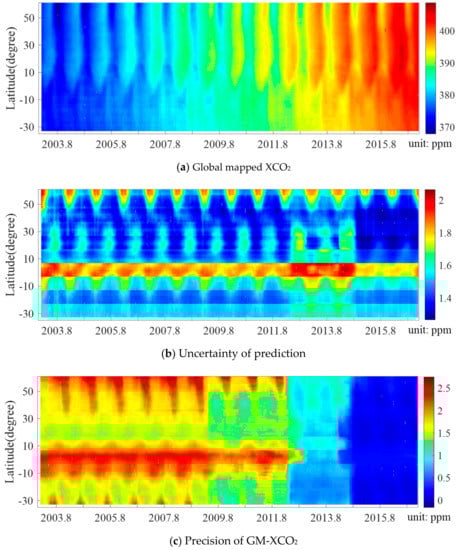 4.2.1. Latitudinal and Temporal Variability of Globally Mapped XCO2