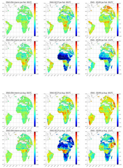 In this section, we compare the LST from ERA5, ERA Interim, ISCCP, and SEVIRI, over the SEVIRI disk. The comparisons were made over the 0.25 ERA grid. Figure 1 presents the differences ERA5-Interim, ERA5-ISCCP, and ERA5-SEVIRI at 00 and 12 UTC, averaged over months for two seasons (January–February and July–August). All data were available at 00 and 12 UTC, so these figures are representative of the general patterns of temperature differences without temporal interpolation. As expected, the two ECMWF products were close to each other, but some differences were nevertheless noted, especially over the inter-tropical zone during the day. During the daytime over arid and semi-arid regions, the infrared-derived ISCCP LST were clearly larger than the ERA5 LSTs (5 K or more on average), but the opposite prevailed over dense vegetation (in the order of 2–5 K). SEVIRI also tended to provide larger LSTs than ERA5 over arid regions during the day, but the difference was smaller than with ISCCP.