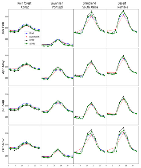 Regardless of the surface type, ERA Interim tended to produce a reduced amplitude of the diurnal cycle of LSTs, with lower LSTs at midday and slightly higher temperature during the night. This is partly due to the 6 h sampling of this product that can miss the maximum and minimum LSTs at local time. The diurnal cycle over dense vegetation (here rain forest) was limited, as expected. ERA5 produced larger LSTs than the other products in this region (including ERA Interim); for example it was about 2 K more than SEVIRI and 2–4 K than ISCCP. Balsamo and Betts [21,32] reported that both TESSEL (used in ERA Interim) and HTESSEL (ERA5) underestimated rainfall and reduced run off in tropical forest significantly. This rainfall underestimation in addition to other issues such as radiation and cloud could lead to higher surface temperature in the reanalyses.