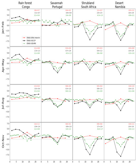 Diurnal LST bias variations (unit: K) for ERA5-ERA Interim, ERA5-ISCCP, ERA5-SEVIRI over four selected vegetation types in January–February, April–May, July–August, and October–November in 2010. X-axis represents local time. The columns represent four selected regions, and the rows for the four seasons.