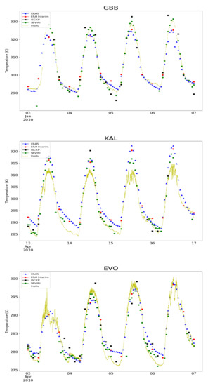 Example observations at GBB, KAL and EVO from ERA5, ERA Interim, ISCCP, SEVIRI, and in situ respectively in 2010.