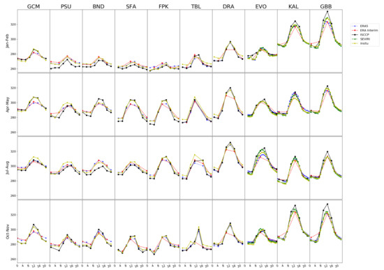 Diurnal variations of monthly mean LST (unit: K) over selected stations, from ERA5, ERA Interim, ISCCP and SEVIRI (when available), and in situ measurements. X-axis represents local time.
