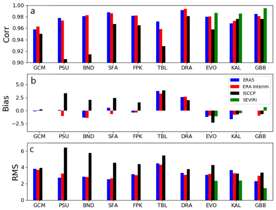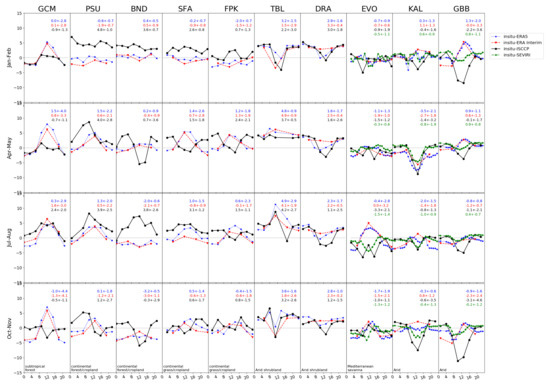 The mean differences between the in situ measurements and satellite/reanalysis products are shown in Figure 9. The results of the KIT and the GCM stations are studied with more details below. Brief information is provided with station environment and climate, and more information can be found in [16,17,38].