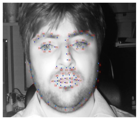Figure 1 shows the flowchart of proposed method for driver’s facial emotion classification for aggressive and normal driving. As shown in steps (1), the NIR camera of our proposed system that is shown in Figure 2 captures the facial images of the user’s frontal view. A NIR camera and illuminator are installed on 24-inch monitor, which display a driving simulator. Aggressive and normal driving experiment is performed while using two types of driving simulators, as it can be dangerous in the real car environment. We have used steering wheel, gear shifter, and pedals for experiment of our all participants in order to give the feeling of real driving environment. Figure 2 shows the driving simulator and Section 4.1 discusses its details. Data acquisition is done while using NIR camera that was manufactured by ELP-USB500W02M [41]. To receive light in the NIR range, a 850 nm NIR band-pass filter is attached with the NIR illuminator [42]. NIR illuminator consists of six NIR light emitting diodes (LED), each LED’s wavelength is 850-nm [43]. The dimensions of obtained facial NIR images are of 640 × 512 pixels with eight bits each are used for data acquisition. Figure 3 shows the samples of the captured images of NIR camera. Obtained image is simultaneously feed into two Dlib facial feature trackers (the details are explained in Section 3.2). The region of interest (ROI) images are obtained based on the 68 facial landmarks that were obtained by Dlib facial feature trackers. The indices of the 68 coordinates of facial landmarks are shown in Figure 4. In Step (2), the ROI images of face, left, and right eye are obtained based on corresponding facial landmark by one Dlib. Similarly, in Step (4), the ROI images of mouth and left, and right eye are obtained based on a corresponding facial landmark while using second Dlib. Obtained ROI from the input NIR-image is used to extract three feature scores i.e., change in horizontal gaze (CHG) and change in vertical gaze (CVG) that are discussed in Section 3.2 and the change in facial emotions (CFE) is discussed in Section 3.3. These extracted feature scores are used to classify aggressive and normal driving based on the extracted feature scores. Classification will be done on the bases of score level fusion, which will be explained in Section 3.4.