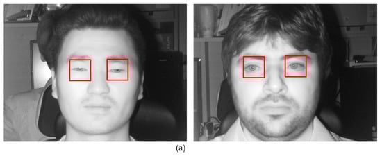 From the facial image, the change in gaze is calculated from defined ROIs of left eye, right eye, and combined left and right eye. Three channel images for calculating change in gaze are obtained by combining three single channel images of left eye, right eye, and combined left and right eye. Figure 6a shows the ROI on the original image and the three channel image that was obtained from the three single channel image is shown in Figure 6b.