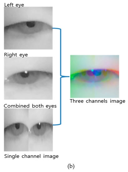 Gaze change obtained by (a) Defining region of interest (ROI) on original image based on facial landmarks. (b) Three channel image obtained by combining left eye, right eye, and combined left and right eye.