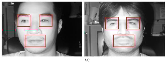 Ekman et al. studied emotional experience through facial signs [46]. In that they found that facial action provide accurate information about human emotions. The mouth and eyes are the main source of information on face area. Hence, in our system, we have extracted the facial emotions from the mouth and left and right eye ROI images, as shown in Figure 7a, with the center of feature points of the mouth and eyes that was previously defined, as shown in Figure 4. The difference images are obtained from the currently extracted three ROI images and previously stored three ROI images of both the eyes and mouth of driver. Previously stored three ROI images are the initial images of the driver when the vehicle starts show normal driving emotion. The variations that were obtained by the difference between the initial ROI images and current ROI images deduce aggressive driving. For facial emotions, the difference image and three channels image that were obtained from the three single channel images are shown in Figure 7b.