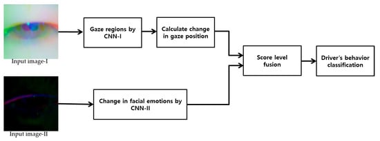 Two images i.e., input image-I and input image-II, are obtained from Section 3.2 and Section 3.3, respectively. Input image-I is three channel image obtained in Section 3.2 i.e., change in gaze (Figure 6). Similarly, input image-II is three channel image obtained in Section 3.3 i.e., facial emotions (Figure 7). These two types of images are used as an input for CNN structures i.e., gaze regions by CNN-I and facial emotions by CNN-II, as shown in Figure 8. The output of gaze regions by CNN-I is 25 gaze regions that were obtained at the output layer of the CNN structure and output of facial emotions is facial feature scores obtained by CNN-II at the output layer of the CNN structure. Horizontal and vertical gaze change is calculated based on the gaze regions that were obtained at the output of CNN-I. Subsequently, the obtained change in gaze is combined with the facial feature score that was obtained from CNN-II through score level fusion. Hence, driver’s behavior i.e., aggressive or normal is classified on the basis of score level fusion.