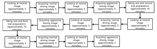 In second part of experiment, we need to train our CNN model for obtaining feature scores for change in facial emotions. We used same 20 participants for collecting data for aggressive and normal driving. In this experiment, facial emotions were recorded while using the experimental setup that is shown in Figure 2. It includes five minutes of normal driving while using a Euro truck driving simulator and another five minutes of aggressive driving was recorded while using need for speed driving simulator, similar to the one used in [29] i.e., multi-camera based system. Each participant watched a sequence of neutral images for five minutes from the international affective picture system to maintain neutral emotion input [60]. We have used 24-inch monitor from Samsung company with model number: LS24D300HLS [61]. Figure 10 illustrates the steps followed during the experimental procedure. Three trials are performed for this experiment for each participant with gap of 10 min for rest.