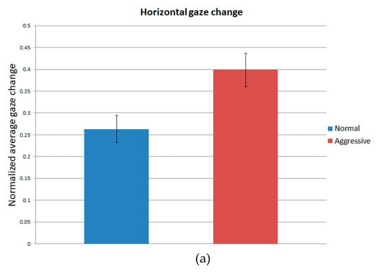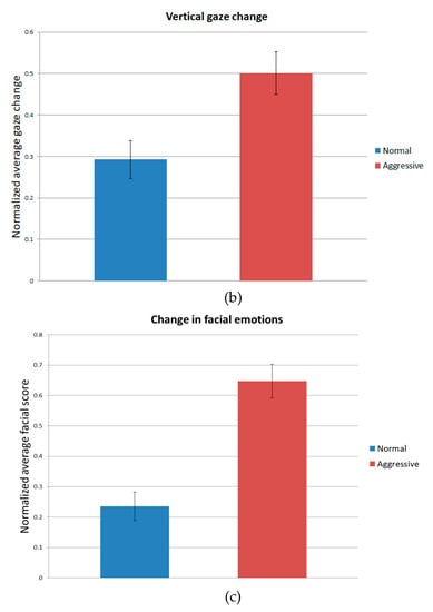 Graphs of mean and standard deviation for three features between normal and aggressive driving: (a) Horizontal gaze change, (b) Vertical gaze change, and (c) Change in facial emotions.