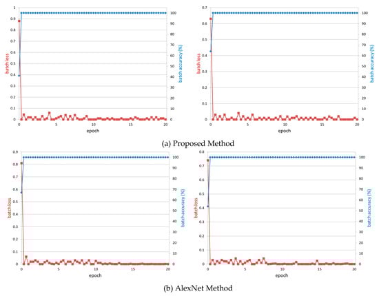 Figure 12 shows the graphs of accuracy and loss for each epoch during the training step for the two-folds of cross validations for the proposed and AlexNet method i.e., Figure 12a,b, respectively. In all cases, the training loss values are close to 0 while the accuracy approaches 100% as the training epoch increases. This proves that the training of the proposed method is sufficient with the training data. When compared to the typical training of CNN structure, the fine-tuning manner is based on the trained CNN model, and the convergence speed of accuracy and loss by fine tuning method is faster than that by typical training.