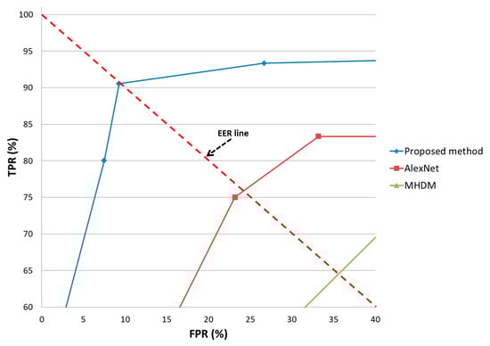 Later, we verified the results of ROC curves on open MAHNOB HCI tagging database [69], as shown in Figure 15. It can be analyzed in the form of ROC curves that our proposed method has also been shown to be better when compared to the previous method (AlexNet) [53] and the modified Hausdorff distance method (MHDM) [37] on open database [69].
