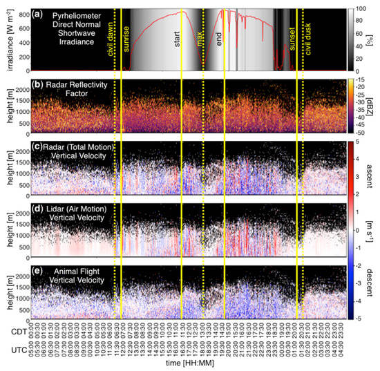 A total solar eclipse presents a unique case for potentially disentangling these effects by rapidly simulating twilight levels of incoming solar radiation at a novel time in the diel cycle. Previous work investigated aerial animal abundance at continental scales during the North American solar eclipse of 2017, reporting changes in altitudinal distributions and overall animal numbers aloft associated with passage of the eclipse [14]. These behaviors were attributed to light cues that evoked the familiar twilight roosting responses of diurnally active animals [14]. A meteorological study of this same event analyzed the effect of the eclipse on boundary-layer evolution, focusing on the land–atmosphere responses to rapid changes in radiative forcing [15]. Atmospheric measurements during the eclipse indicated a rapid halt to vertical motions, collapse of the convective boundary layer, and descent and decrease of water vapor concentrations aloft [15]. Interestingly, the spatiotemporal patterns found in aerosol and water vapor concentrations—passive tracers of boundary-layer structure—broadly match changes in aerial animal abundance and altitudinal distributions during the eclipse, potentially suggesting a coupled effect between animal flight behavior and boundary-layer dynamics. As a result, the effect of the eclipse on animal flight behavior—or lack thereof—is ambiguous, and requires additional analysis to determine whether animals are actively responding to optical cues or mirroring ambient boundary-layer structure.