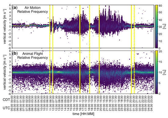 Time evolution of boundary-layer vertical motions and animal flight behavior. Two-minute relative frequency distributions of (a) atmospheric vertical motions, and (b) animal flight velocity (note that colorscale varies between a and b). Positive velocities indicate ascent and negative velocities indicate descent. Vertical yellow bars denote (left to right) onset of civil twilight, sunrise, start of eclipse, maximum eclipse, end of eclipse, sunset and end of civil twilight, as defined in Figure 1.