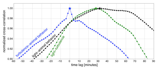 Normalized cross-correlation functions of turbulence and animal behavior (blue), light level and animal behavior (black), and light level and turbulence (green). The maximum cross correlation value of each pair is indicated by a star.