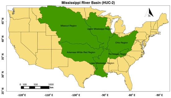 A map of the Mississippi basin showing the six USGS Hydrologic Unit Code (HUC)-2 basins.