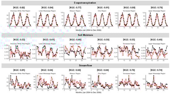 Time series plots of (1) top panel: Evapotranspiraton-calibrated (ET-calibrated) model ET (red) and the Global Land Evaporation Amsterdam Model (GLEAM) observed ET (black) in mm/month, (2) middle panel: Soil moisture-calibrated (SM-calibrated) model SM (red) and the European Space Agency–Climate Change Institute (ESA–CCI) observed SM (black) in m3/m3 and (3) bottom panel: Streamflow-calibrated (SF-calibrated) model SF (red) and observed Hydrologic Unit Code-2 (HUC-2) runoff (black) in mm/month for the six HUC-2 sub-catchments of the Mississippi basin. The first 12 months correspond to the calibration period of 2004 and the next 24 months correspond to validation years 2005 and 2006. The corresponding Kling-Gupta Efficiency (KGE) values are presented in each panel.