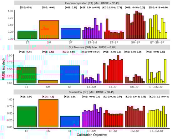 Bar plots of scaled RMSE values of basin averaged monthly ET (top panel), SM (middle panel), and SF (bottom panel) when the Noah-MP model is calibrated with (1) ET, (2) SM, (3) SF, (4) ET–SM, (5) ET–SF, (6) SM–SF, and (7) ET–SM–SF as calibration objectives (x-axis in all three panels). RMSE values for ET, SM, and SF are scaled by the maximum RMSE across the seven calibration cases. The maximum values are provided in the header of each panel within square brackets. The multivariate calibration results are derived by taking 10 samples from different points on the Pareto fronts. We also present KGE values for each of the calibration cases above each barplot. For multivariate calibration cases, only the range of KGE values from the selected Pareto-optimal parameter sets are shown.