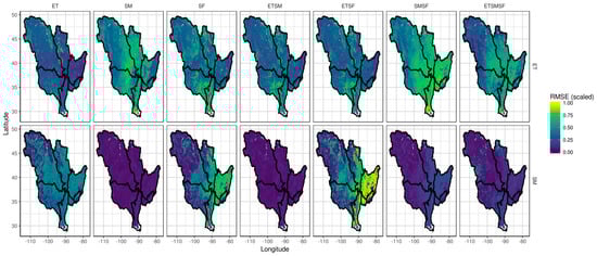 Spatial plots of scaled RMSE values of ET (top panel) and SM (bottom panel) when the Noah-MP model is calibrated with (1) ET, (2) SM, (3) SF, (4) ET–SM, (5) ET–SF, (6) SM–SF, and (7) ET–SM–SF as calibration objectives.
