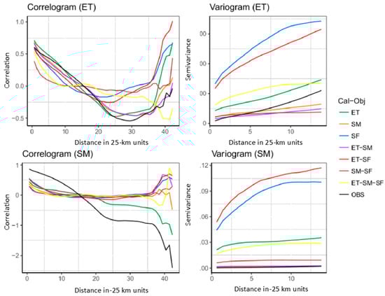 Correlogram and Variogram of ET (top panel) and SM (bottom panel) when the Noah-MP model is calibrated with (1) ET, (2) SM, (3) SF, (4) ET–SM, (5) ET–SF, (6) SM–SF, and (7) ET–SM–SF as calibration objectives.