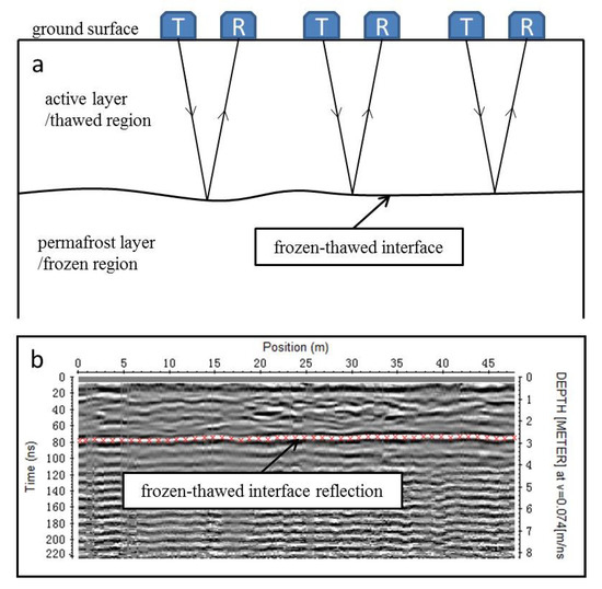 (a) Schematic diagram of active layer detecting with ground-penetrating radar (GPR); (b) real GPR profile data with the interpreted frozen–thawed interface reflection.