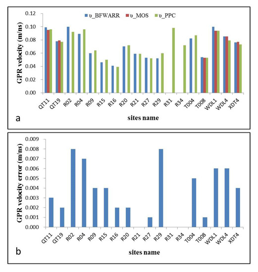 (a) Velocity comparison acquired by three different GPR detecting methods, blue bar (υ_BFWARR); velocity from wide-angle reflection and refraction methods, red bar (υ_MOS); velocity from multi-offset soundings, green bar (υ_PPC); velocity from pit profile calibration. (b) Absolute error between υ_PPC, υ_BFWARR, and υ_MOS.