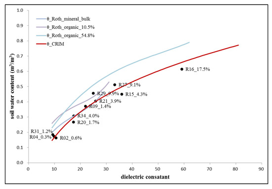 Specifically for organic soil, many researchers had developed calibration curves and their results were summarized and compared by Lange [22] and Bircher [23]. Among these organic soil calibration curves, we chose these that are close to our data, which were recommended by Roth [8], to analyze the influence of soil organic content on the soil water content calculation. Figure 11 showed calibration curves of organic content at 10.5% and 54.8% (θ_Roth_organic_10.5%, θ_Roth_organic_54.8%), and the bulk composited curve of mineral soils with a sand content range from 2% to 88% (θ_Roth_mineral_bulk). The comparison of the three Roth’s calibration curves revealed that under the same dielectric constant, organic soil generally has higher water content than mineral soil under the same soil dielectric constant conditions. The influence of organic content on soil water content calculation can also be found with our data. Depth-weighted average organic contents within the active layer on our research regions varied from 0.3% to 17.5% (Table 1). There are two pairs of data points in which we can find the influence of organic content. R34 and R20 have the same dielectric constant of 17. For the former, which had an organic content of 4.0%, the measured soil water content was 0.04 m3/m3 higher than the latter, which had an organic content of 1.7%. R29 and R21 appeared to have similar dielectric constants of 25 and 26, respectively. For the former, which had an organic content of 9.9%, the measured soil water content was 0.05 m3/m3 higher than the latter, which had an organic content of 3.9%. Although there were water content differences arising from organic content variation, the magnitude of deviation and the excellent performance of our acquired CRIM reminded us that the influence of organic content can be neglected at least at an organic content level below 17.5% for the active-layer soil moisture calculation.