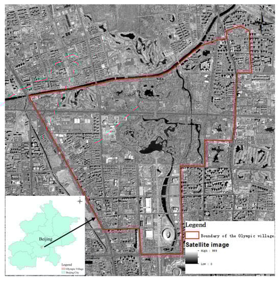 The study area is the Olympic Village in Chaoyang District in Beijing, China, with an area of 19.6 km2 on a flat terrain and a population of about 130,000 as of 2015 living in 12 neighborhoods. The land use types of the study area include residential area, school, hospital, stadium, river, lake, and forest. The Olympic Village was initially built to accommodate athletes during the Beijing 2008 Olympic Games and was converted into residential areas afterwards. Compared to most conventional residential areas in Beijing, the population density in the Olympic Village is more homogeneous among buildings with the same physical properties, which makes it a suitable area for this study in which we focus on the relationship only between population density and the physical properties of buildings, with the hope of minimizing the effects of other factors on population density. The location of the study area is shown in Figure 1.