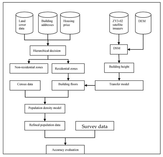 where j is the number of pixels or grids in the study area; n is the total pixels in the study area; represents the building type (=1 if residential, =0 otherwise); is the total population in the study area acquired from census; represent the building floors of pixel j; A represents the area of a pixel or grid in the study area (size = 2.1 m × 2.1 m). and represent the building floors and the area of building i. The whole flowchart of methods for dasymetric modeling is shown in Figure 2.