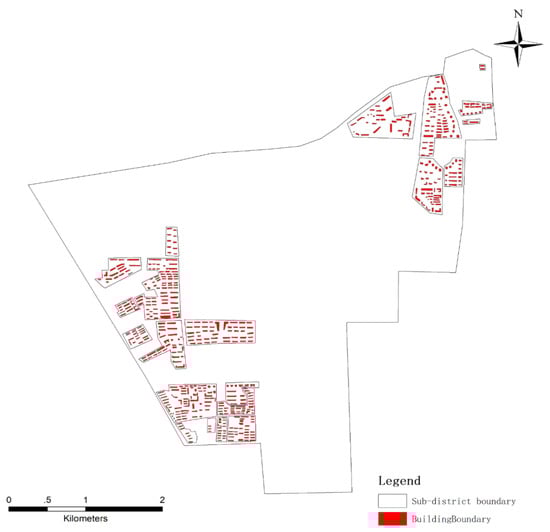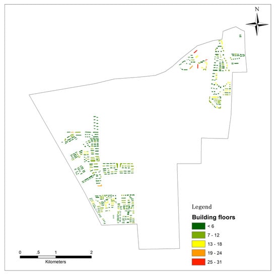 where i is the number of buildings, represents the account of the ith building floors in the residential zones. represents the height of the ith building in the residential zones. represents the average floor height of the ith building in the residential zones. Since different buildings have different floor heights the study area varies from 2.8–3.2 m. The floor height for each building or floor is difficult to survey. Therefore, we set a fixed value of 3 m instead of the average floor height of building in Equation (1).