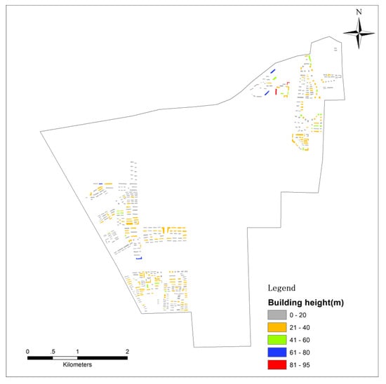 The extracted building heights in the residential zones are shown in Figure 5. As a statistic, we graded them into five ranges including <20 m, 21–40 m, 41–60 m, 61–80 m, and >80 m. In total, 358 buildings have a height below 20 m, and account for 66% of the residential buildings. The highest building is 95 m, and only two buildings have a height that is over 80 m.
