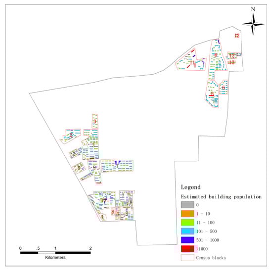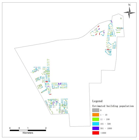 According to Equation (2), the estimated building population was calculated based on total population and building floor and area data. We classified the population density into six types including 0, 1–10, 11–100, 101–500, 501–1000, and >1000. The result is shown in Figure 7. Overall, 542 buildings have a total population of 139,223, with an average population of 257, a minimum of 0, a maximum of 3322, and a standard deviation of 342.