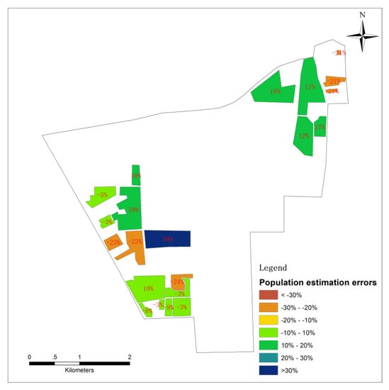 The study area includes 12 communities (census blocks, see Figure 8); we used the census data of 12 communities in 2017 to validate the estimated population produced by the model. The population estimation errors are shown in Figure 9. Six census blocks were overestimated, and the other six blocks were underestimated. The maximum is block 1, with an error of 34%. The minimum is block 8, with an error of −3%. The errors in the study were mainly caused by the processes of building area and height extraction. The accuracy of the population simulation relies on the methods of object classification and height extraction. The object-oriented classification used in the study is a comprehensive analysis on the basis of the spectral, shape, texture, shadow, and spatial position of each object. When the size, shape, and distribution of the buildings are relatively regular, the classification accuracy is high. However, there is an absolute error mainly ranging from 2 m to 5 m while using the stereo pair photogrammetry. The bigger the building height, the smaller the relative error. Therefore, our method is more effective for urban areas where residential buildings have a regular size, shape, distribution, and high-rise.