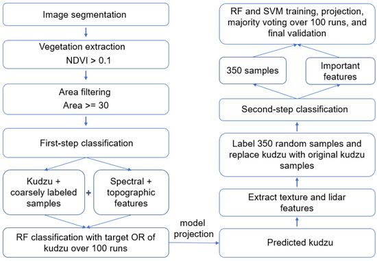 The workflow included a two-step classification: (1) the first-step classification used accurately labeled kudzu samples and extensive coarsely labeled vegetation samples to construct an overprediction model of kudzu, and (2) the second-step classification used 350 randomly extracted and accurately labeled samples from the overpredicted kudzu map to refine the classification. The designed workflow can potentially decrease the computational cost by only using computational-intensive features, including gray-level co-occurrence matrix (GLCM)-derived textural features and lidar point clouds derived features, at the second step. The sampling effort is decreased for non-target species by using extensive coarsely labeled samples at the first step and accurately labeling a relatively small set of samples at the second step. By integrating high-resolution multispectral and lidar point clouds data and conducting OBIA, this workflow can also improve detection accuracy on target vegetation species. The proposed workflow can be easily implemented to map kudzu in other regions as well as map other vegetation species.
