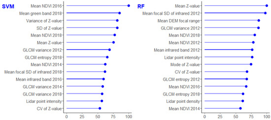 The 15 most important features ranked by support vector machine (SVM) and random forest (RF) over 100 runs for the second-step classification. NDVI, SD, GLCM, and CV are acronyms for normalized difference vegetation index, standard deviation, gray-level co-occurrence matrix, and coefficient of variance, respectively. The values on x-axis indicate the importance of each variable for model construction with higher value suggesting higher importance.