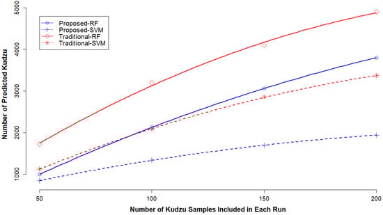 Given the apparent overprediction of the traditional method and the fact that more kudzu samples included in each run led to higher overprediction (details in Section 3.3), only 50 randomly extracted kudzu samples from the 320 samples were included in each run. The traditional method with one-step sampling had overprediction of kudzu, leading to high PA but low UA (Table 5). The overprediction was a result of misclassification of grass and other herbaceous plants as kudzu (Figure 5). Using a sub-sampling from the predicted kudzu by the first step dramatically improved the classification accuracy (Table 5). However, the traditional methods had constantly lower accuracy compared to the proposed method (Table 5).