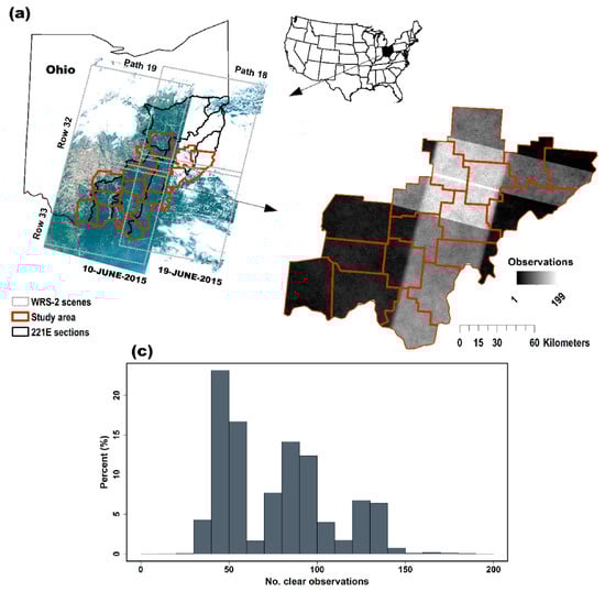 (a) The Ohio portion of the Southern Unglaciated Allegheny Plateau (221E) Section (and subsections; black lines) and 17-county study area in relation to WRS-2 scenes (Path/Row) 18/32, 18/33, 19/32, and 19/33; the example mosaic includes four images of varying cloud intensity; (b) the amount of clear Landsat 8-Operational Land Imager (OLI) observations across the region used in analyses; (c) a histogram on the numerical distribution of clear observations across the study area.