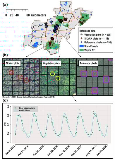 (a) Reference data; (b) sampling framework of reference data relative to Landsat pixels (black grid cells); (c) example harmonic model fitted to EVI observations for a selected pixel time series.