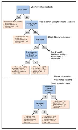 Since the reference plot data were acquired in raw inventory form, we developed a flexible classification system to categorize the plot data into forest type classes to enable modeling of pixel-level estimates of forest types across the study area. Our hierarchical approach combined (i) manual interpretation of the detailed plot data with (ii) data-driven constrained clustering of a subset of plots. As previously described, slope orientation and location in context to ridgetops and bottomlands, is the predominant natural mechanism for compositional turnover in the study area [,]. Thus, our classification system incorporated this perspective into a landtype/central taxonomic tendency and/or physiognomic concept. To prepare the two inventories (detailed vegetation and SILVAH plots) for classification, local stem densities (stems ha–1) and basal areas (m2 ha–1) were computed for each tree species/genera, and final compositional variation was expressed by calculating an importance value (IV) for each taxon for each plot [,]. The IVs were calculated by summing the relative density and relative basal area of each species/genera per plot. In each dataset, only records pertaining to large stems (i.e., trees) ≥8 cm DBH were used in developing our system. The IVs were used to identify canopy dominance, as well as indicator species scores []. After merging the two inventories, a total of 68 woody plant species/genera were considered for plot-level grouping in our classification. A decision tree summarizing our decision rules is provided in Figure 3.