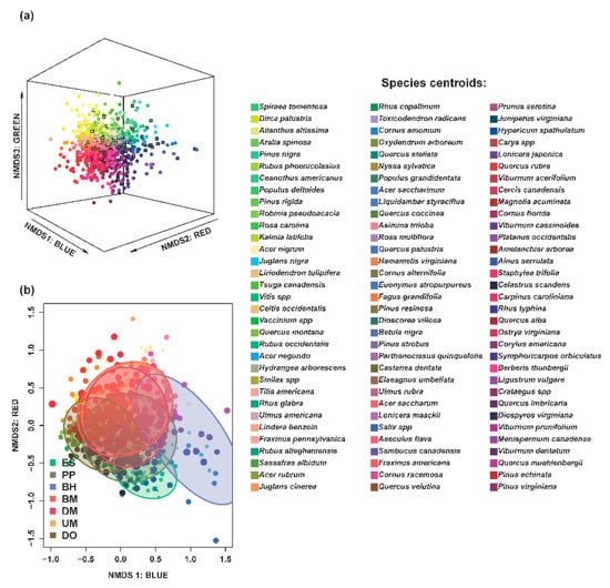 We used an ordination-regression approach for gradient modeling of forest composition across the study area [,,]. The goal of ordination is the reduction of complex ecological datasets to a smaller number of dimensions that preserve the underlying compositional gradients among a reference sample. The resulting ordination scores were then modeled across the study area to relate mapped locations with similarity to the original dataset in the gradient modeling approach. Non-metric multidimensional scaling (NMDS) was chosen for its non-parametric nature and flexibility in accommodating user-specified distance matrices and desired number of dimensions (k). The dense vegetation plot data, including stem counts from both overstory and understory species, were selected as the reference data for this approach. Local stem densities (stems ha-1) from both the small and large stem data and basal areas (m2 ha-1) of large stems among 99 woody plant taxa were used to generate IV for each species/genus among each plot. Functions provided in the vegan package [] in R were used to ordinate the species dataset onto a three-dimensional, k = 3, solution. Bray–Curtis dissimilarity was selected for the distance matrix due to its handling of "null" values (i.e., zero species abundances) among pairs of sample plots. The ordination procedure was initiated following Wisconsin and square root transformations []. The NMDS procedure uses an interactive approach to sample entity placement in the final gradient space. It begins with an initial random arrangement, then reorders the data striving to maximize the rank-order correlation between the original compositional distances and the distances in the reduced space. The minimum "stress" solution, i.e., maximally correlated with the original distances among those solutions tried, was subjected to a principal component rotation to achieve an expression of maximum floristic variation among the three orthogonal axes. A maximum of 500 random starts was employed, and the final solution was obtained following a minimum stress value being achieved twice in a row. The specific dimensionality was chosen such that each of the axes could be assigned to one of each of the three channels in the RGB color space [].