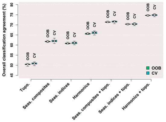 Agreement scores of the spectral, harmonic, topographic, and combined feature sets, measured as the percentage overall accuracy, for seven forest classes and by two assessments (out-of-bag [OOB] from internal Random Forests procedures and independently assessed cross-validation [CV]). The distributions of agreement scores are displayed as notched boxplots, in which the median is designated by dark horizontal lines, confidence intervals (95%) around the median by the notches, mean agreement by the white dots, and minimum and maximum values by the whiskers.